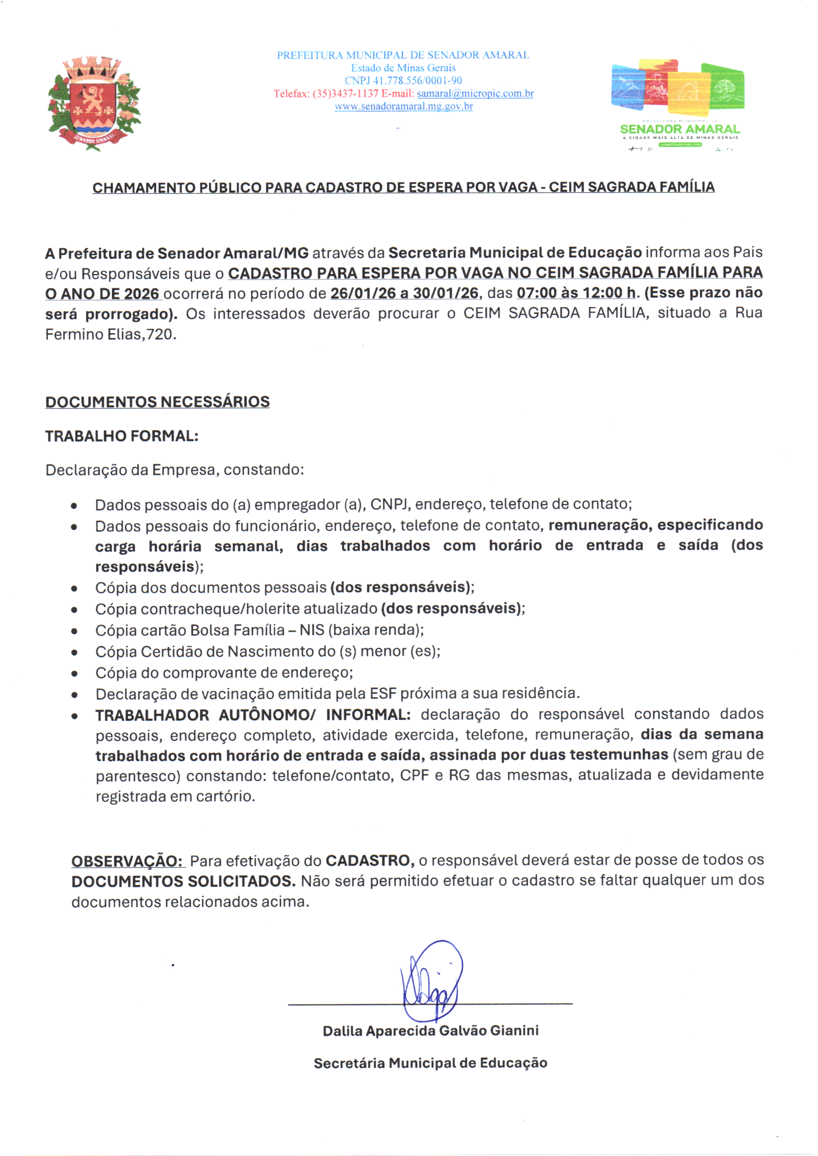 Educação Esporte e Lazer CHAMAMENTO PÚBLICO PARA CADASTRO DE ESPERA POR VAGA – CEIM SAGRADA FAMÍLIA